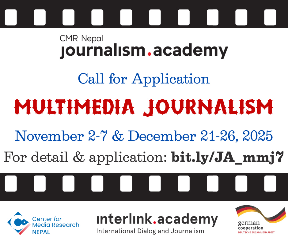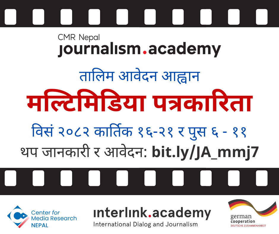 सिएमआर नेपाल जर्नलिजम एकेडेमीले विसं २०८२ को कार्तिक/पुसमा हुने मल्टिमिडिया पत्रकारिता (Multimedia Journalism) तालिमका लागि आवेदन खुल्ला गरेको छ।